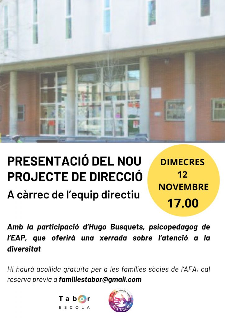 Dimecres 12 de novembre a partir de les 16.45 hores l’equip de direcció de l’escola presentarà el seu projecte per al període 2025-29. L’equip directiu, que va renovar mandat aquest estiu, compartirà amb les famílies les línies principals de treball i els reptes per als propers anys, remarcant-ne que és un projecte de continuïtat.