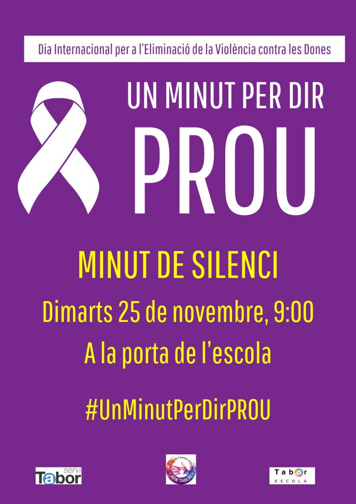 Dimarts 25 de novembre, tornarem a fer un minut de silenci a la porta de l’escola amb motiu del Dia Internacional per a l’Eliminació de la Violència contra les Dones. És una acció que convoquem conjuntament l’Equip directiu, el Claustre, Servitabor i l’AFA i que necessita de totes i cadascuna de les persones que formem la comunitat Tabor.